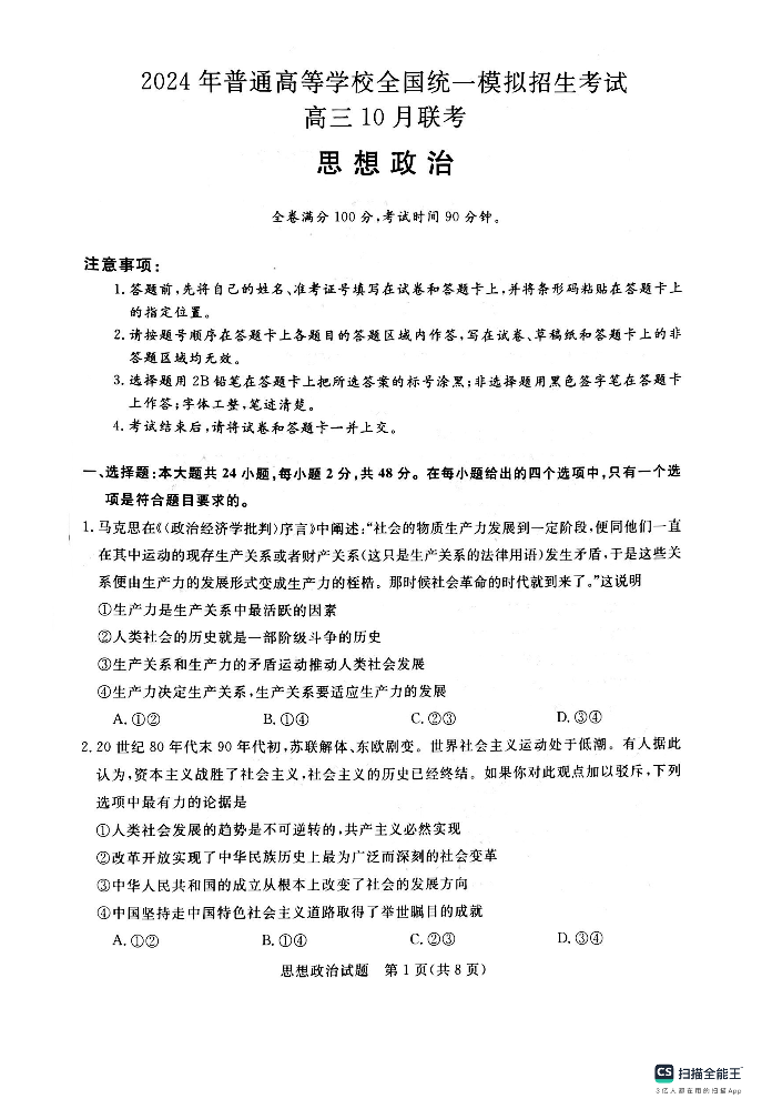 河南省新未来联考2023-2024学年高三上学期10月联考 政治