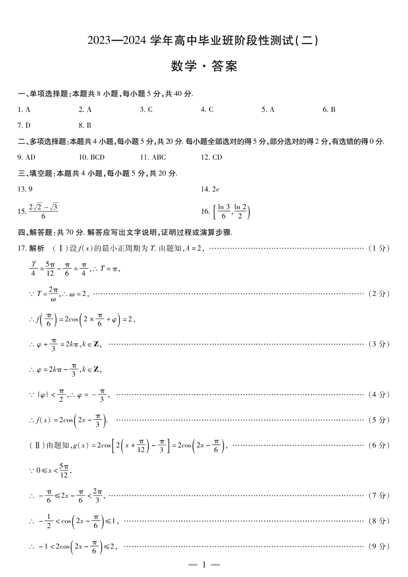 河南省天一大联考2023-2024学年高三上学期阶段性测试(二)数学答案
