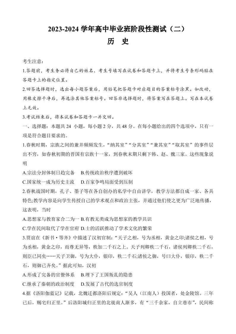 河南省天一大联考2023-2024学年高三上学期阶段性测试(二)历史