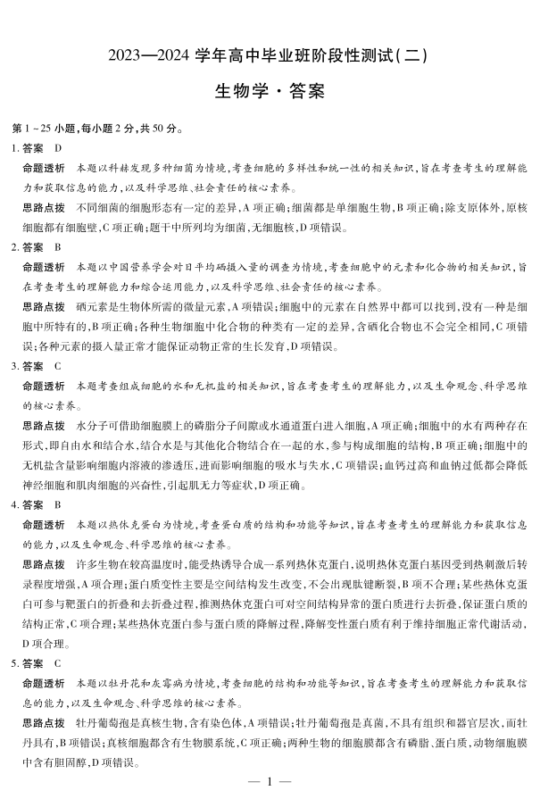河南省天一大联考2023-2024学年高三上学期阶段性测试(二)生物答案