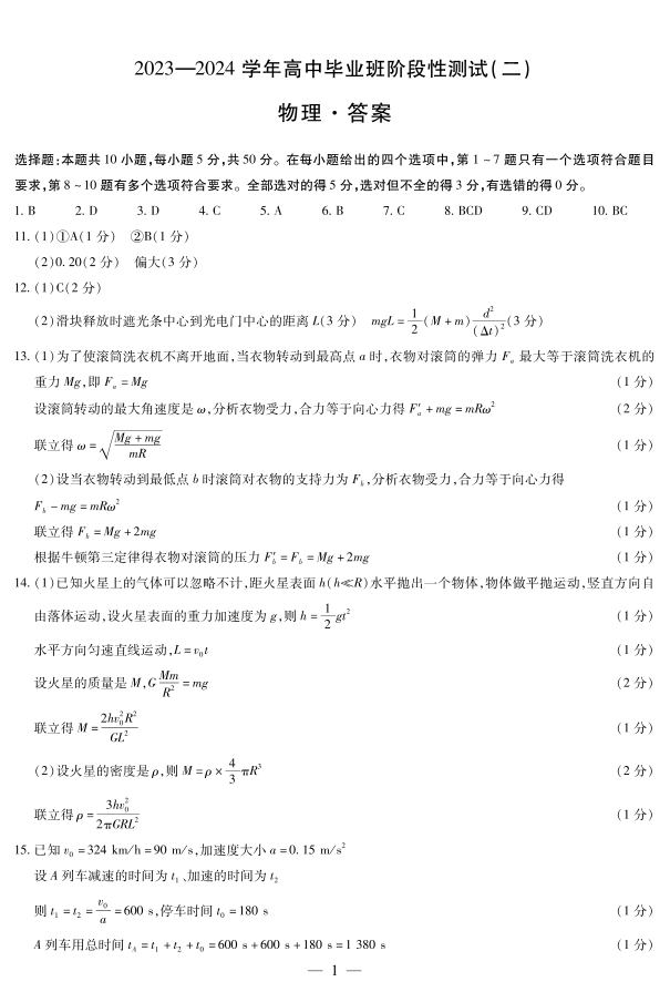 河南省天一大联考2023-2024学年高三上学期阶段性测试(二)物理答案