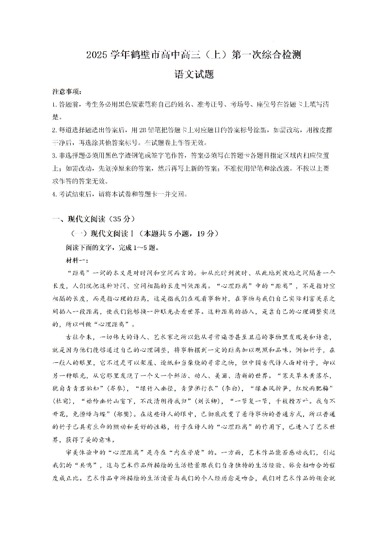 河南省鹤壁市高中2024-2025学年高三上学期第一次综合检测+语文