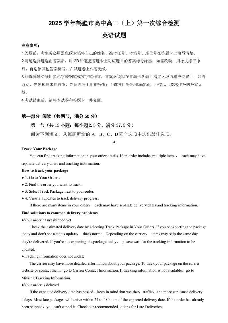 河南省鹤壁市高中2024-2025学年高三上学期第一次综合检测+英语