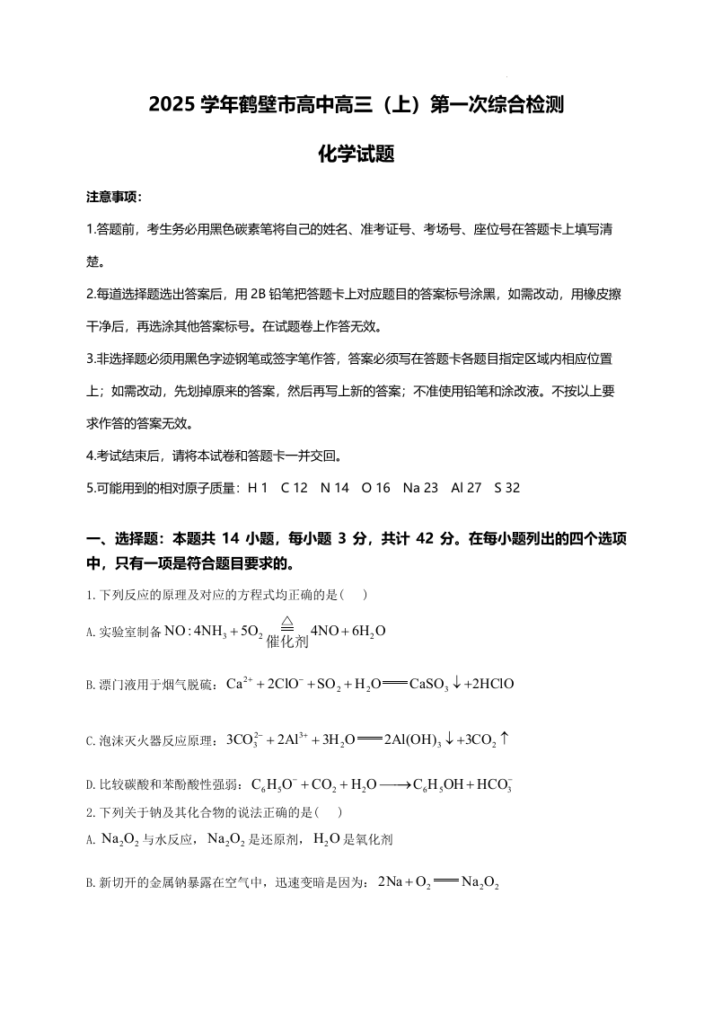 河南省鹤壁市高中2024-2025学年高三上学期第一次综合检测+化学