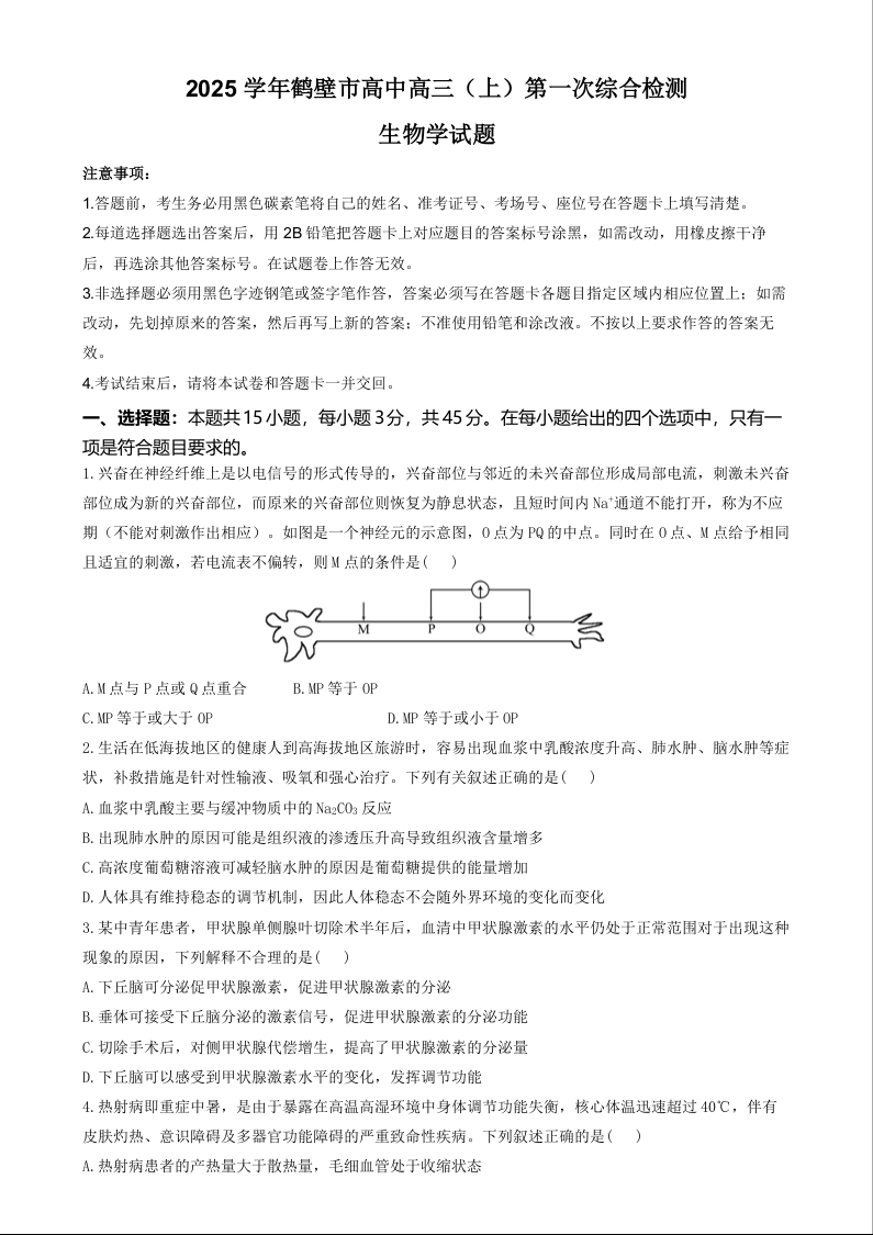 河南省鹤壁市高中2024-2025学年高三上学期第一次综合检测+生物