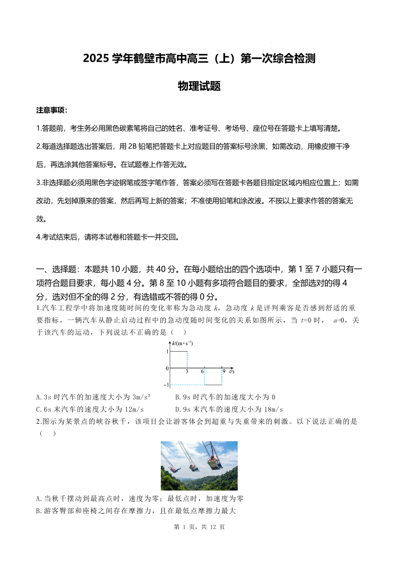 河南省鹤壁市高中2024-2025学年高三上学期第一次综合检测+物理