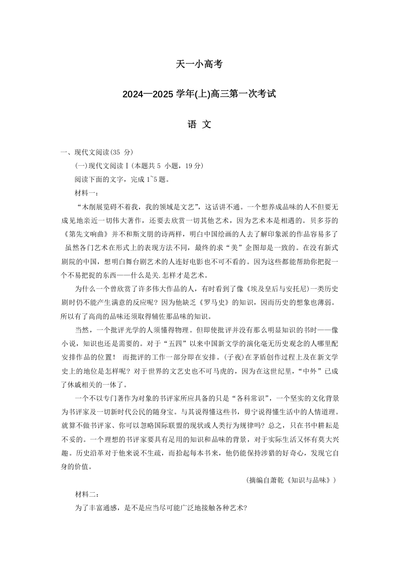 天一大联考2024-2025学年(上)高三第一次考试+语文