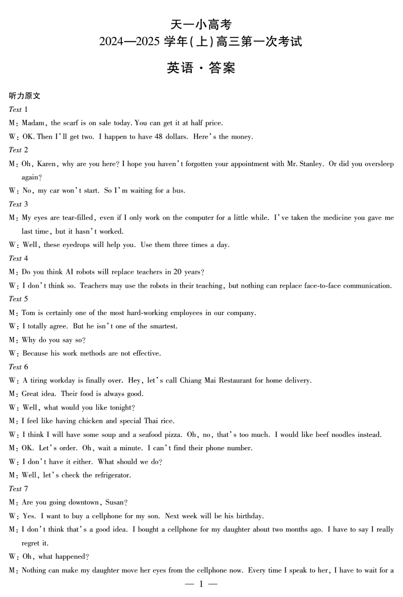 天一大联考2024-2025学年(上)高三第一次考试+英语答案