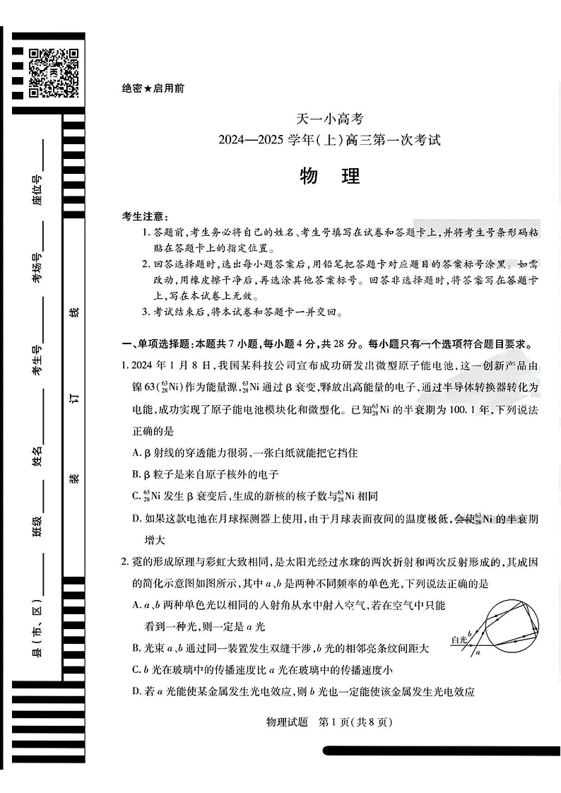 天一大联考2024-2025学年(上)高三第一次考试+物理