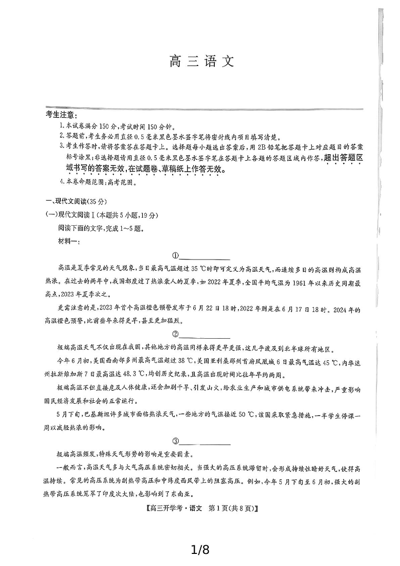 河南省开封五县考2024-2025学年高三上学期开学联考+语文