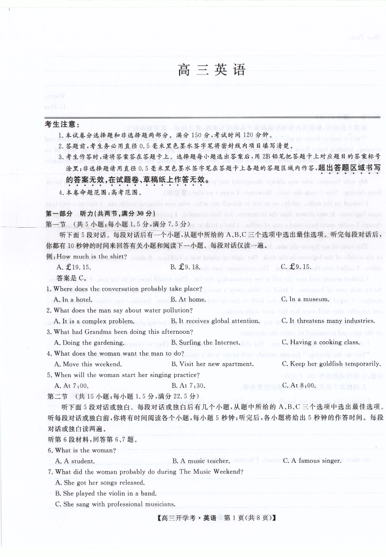 河南省开封五县考2024-2025学年高三上学期开学联考+英语