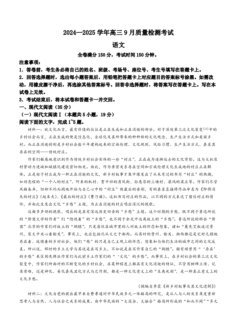 河南省青桐鸣2024-2025学年高三9月质量检测考试联考+语文