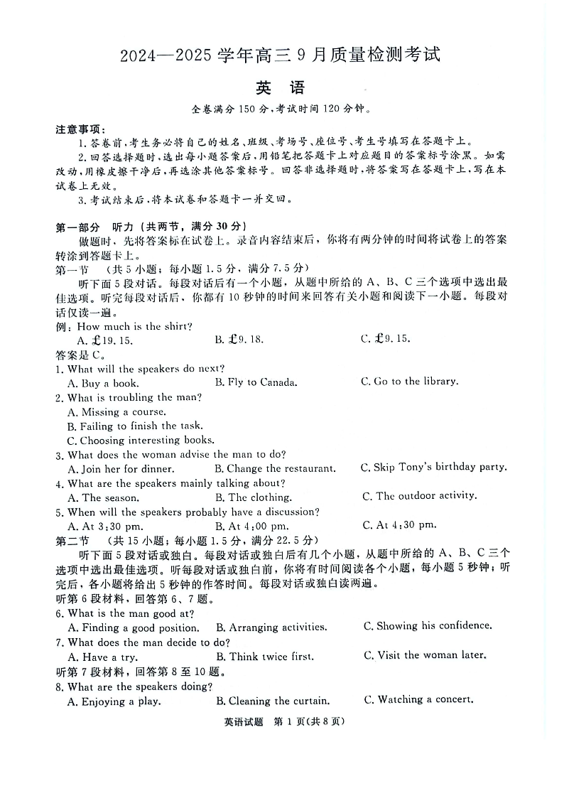 河南省青桐鸣2024-2025学年高三9月质量检测考试联考+英语