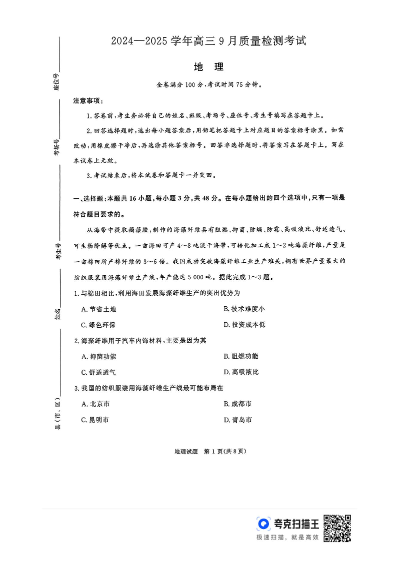 河南省青桐鸣2024-2025学年高三9月质量检测考试联考+地理
