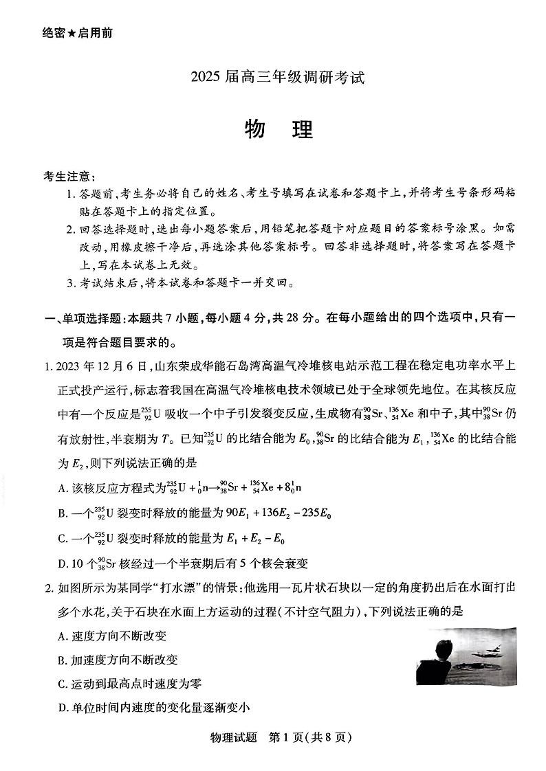 河南省天一大联考2025届高三年级9月调研考试+物理