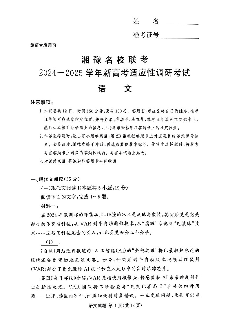 湘豫名校联考2024-2025学年新高考适应性调研考试+语文