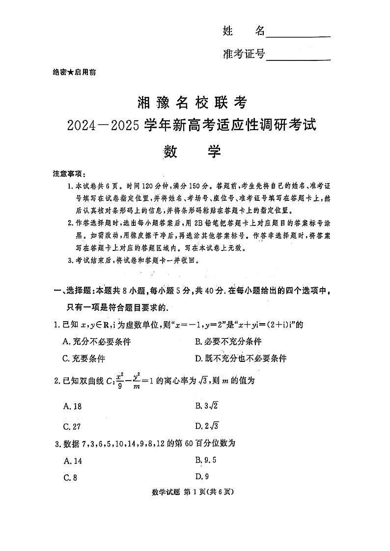 湘豫名校联考2024-2025学年新高考适应性调研考试+数学