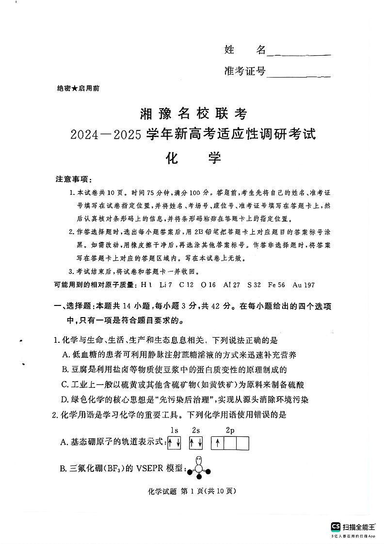 湘豫名校联考2024-2025学年新高考适应性调研考试+化学