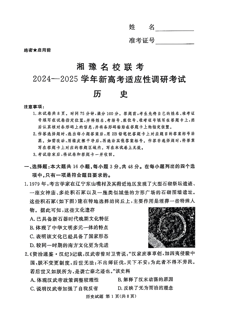 湘豫名校联考2024-2025学年新高考适应性调研考试+历史