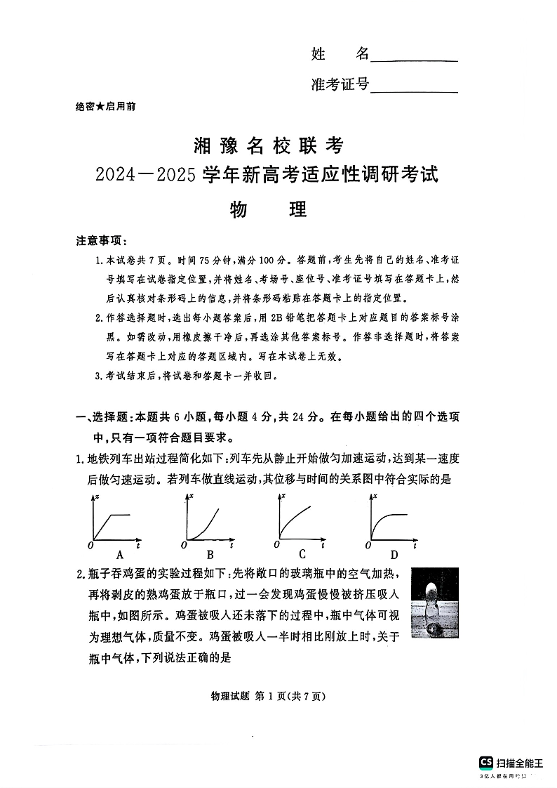 湘豫名校联考2024-2025学年新高考适应性调研考试+物理