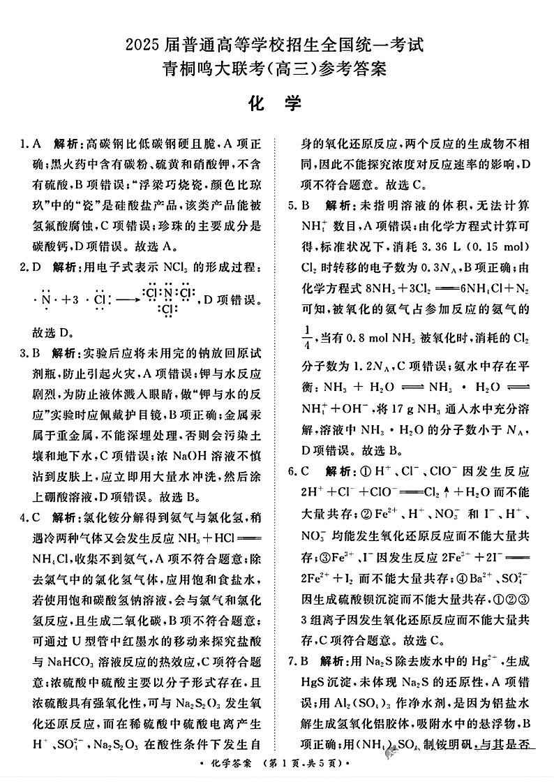 青桐鸣2025届高三10月大联考+化学答案