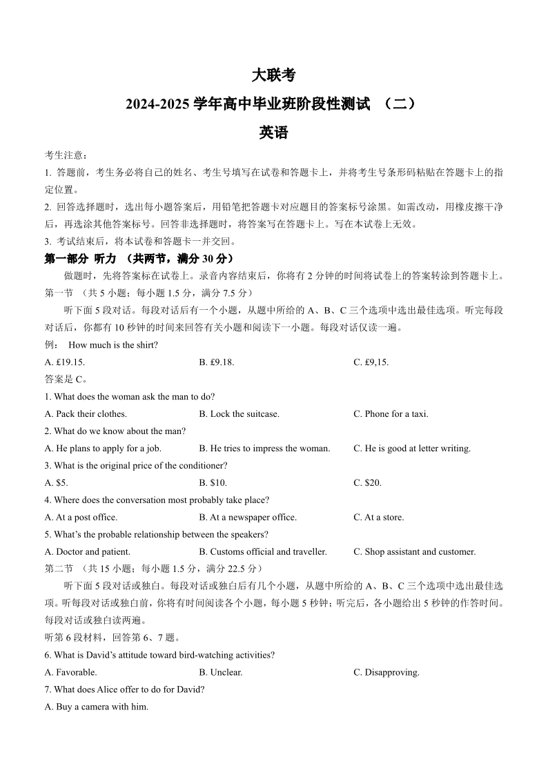 河南省天一大联考2024-2025学年高三上学期阶段性检测(二)英语