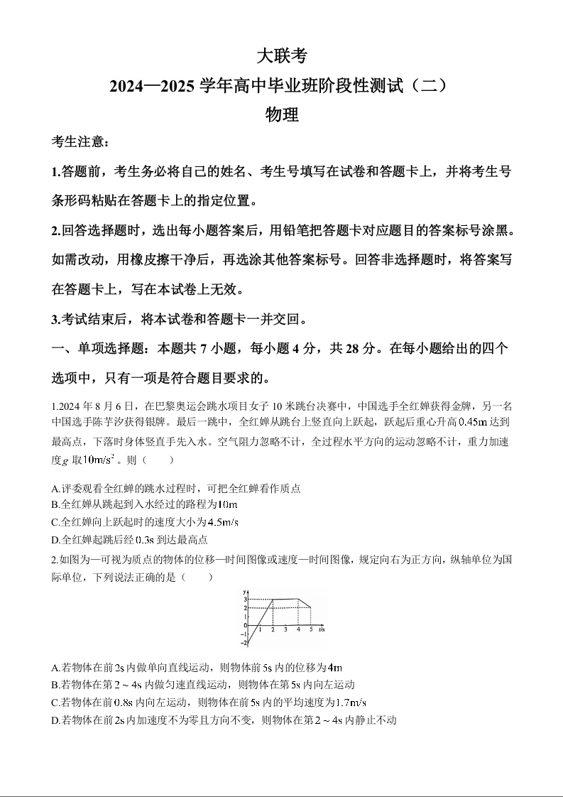 河南省天一大联考2024-2025学年高三上学期阶段性检测(二)物理