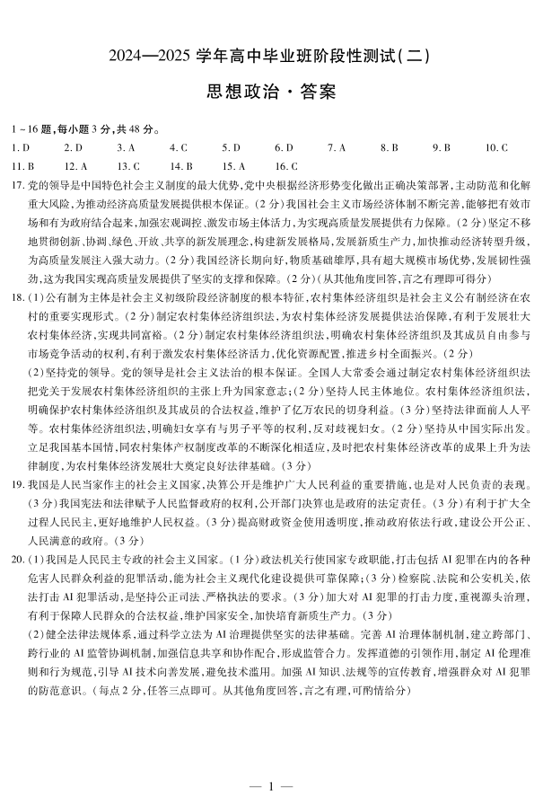 河南省天一大联考2024-2025学年高三上学期阶段性检测(二)政治答案