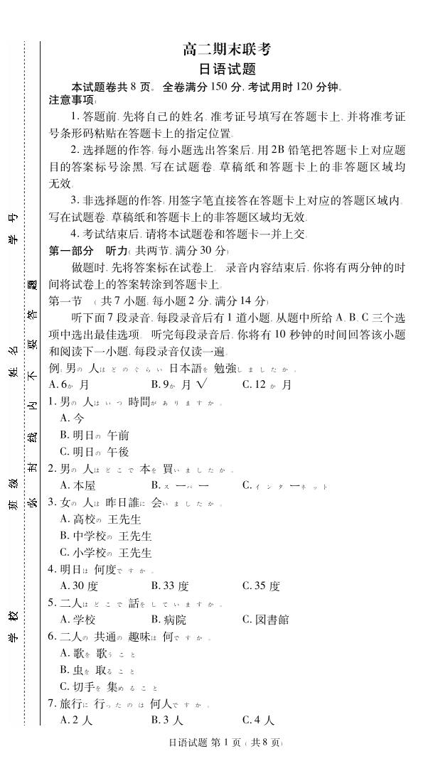 高二期末联考日语正文