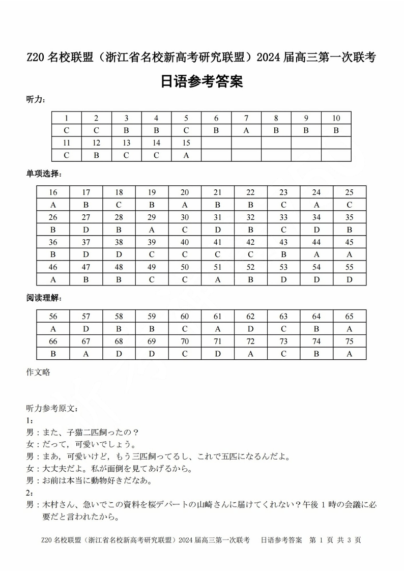 2024届Z20名校联盟(浙江省名校新高考研究联盟)高三第一次联考+日语答案