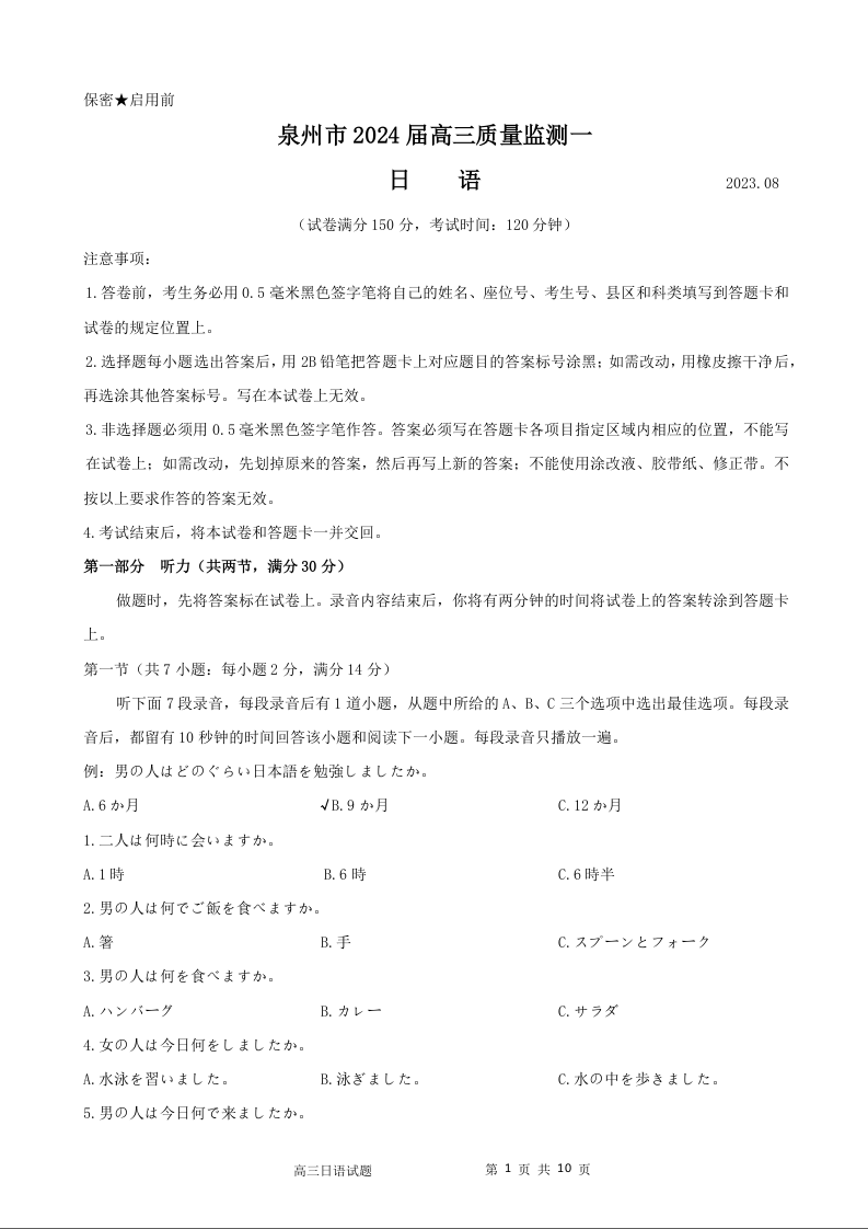 泉州市2024届高中毕业班质量监测(一)日语试题(2023.8.28)