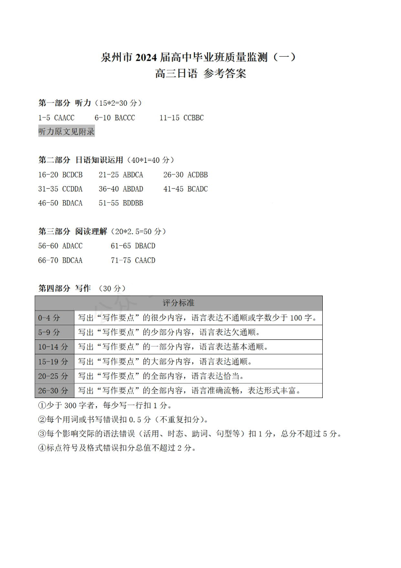 泉州市2024届高中毕业班质量监测(一)日语答案