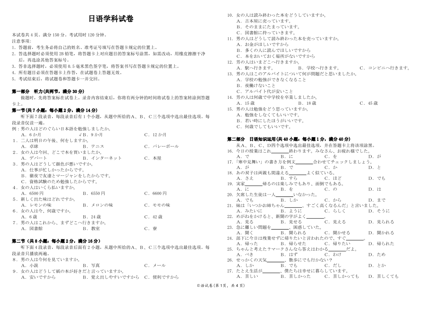 2023年湖北省新高考联考协作体高三9月起点考试+日语
