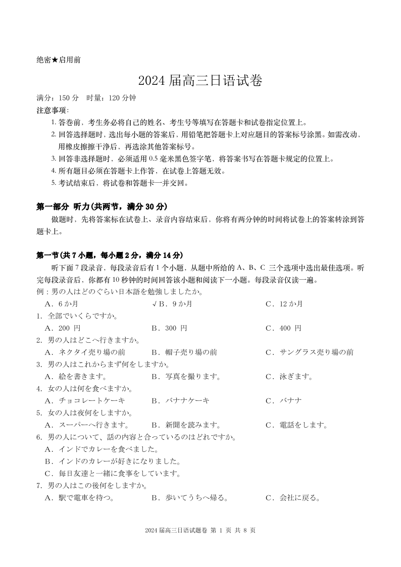 【试卷】2024届湖南部分校高三返校摸底测日语