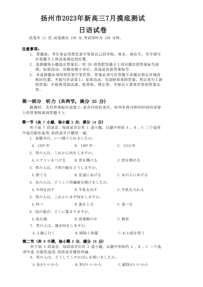 【试题】江苏省扬州市2023-2024学年高三上学期七月摸底测试日语