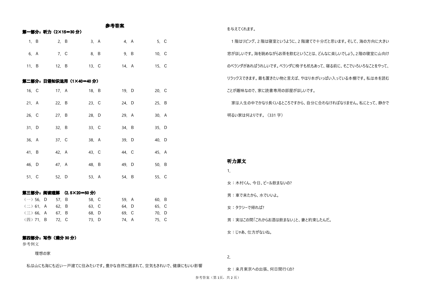 黄冈市2023年高三年级9月调研考试+日语参考答案