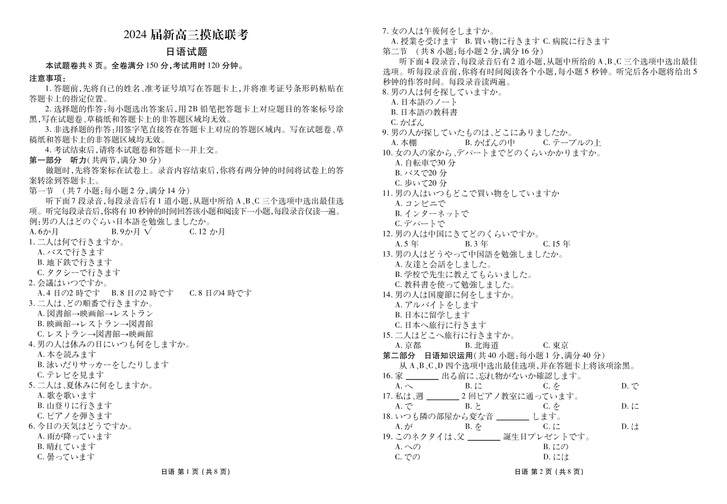 【试题】2024届全国部分重点中学新高考摸底联考日语