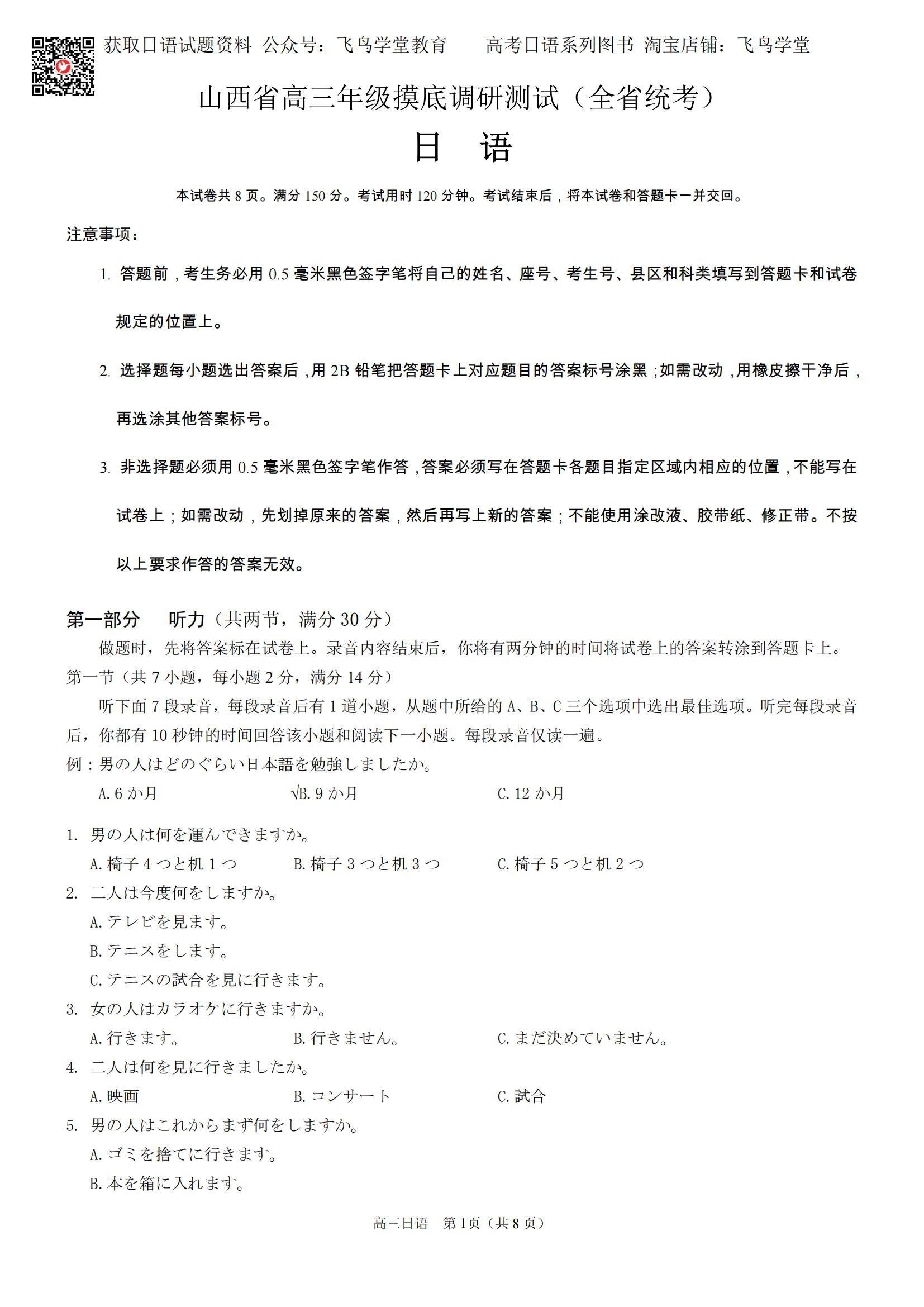 山西省2022-2023学年高三年级入学教学质量监测考试日语试题