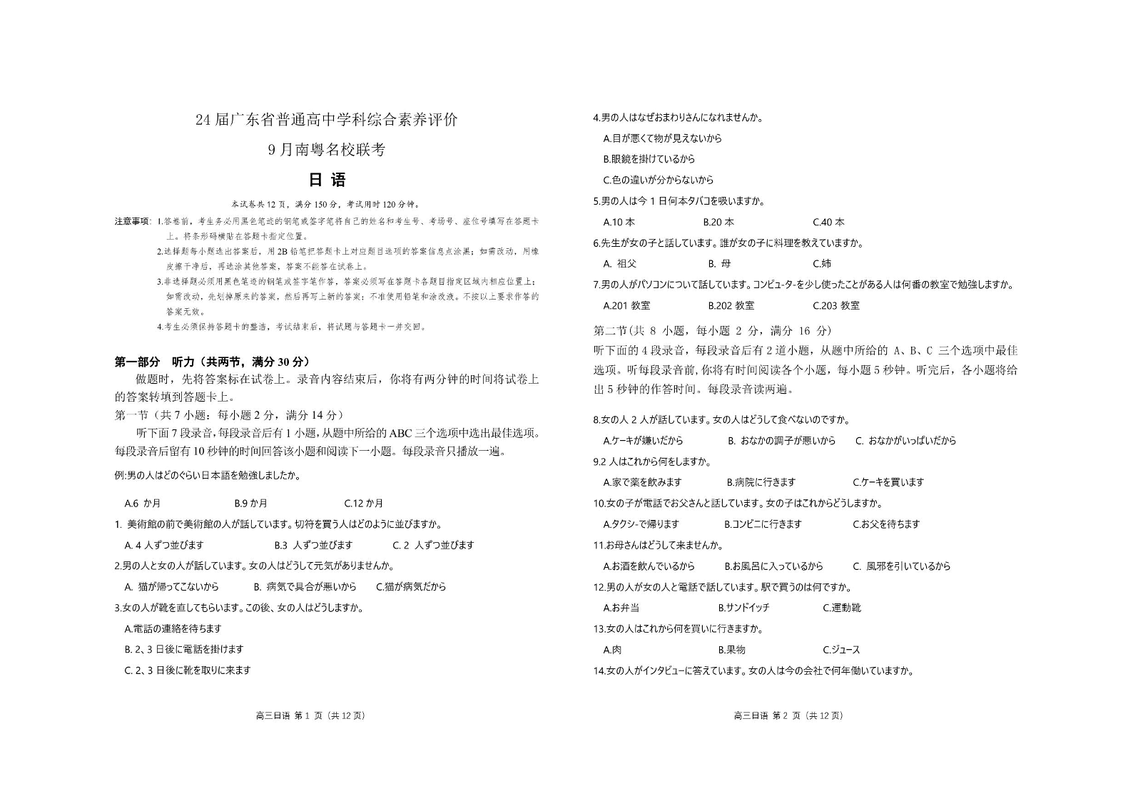 【试题】广东省高三联考2023-2024学年高三上学期9月月考