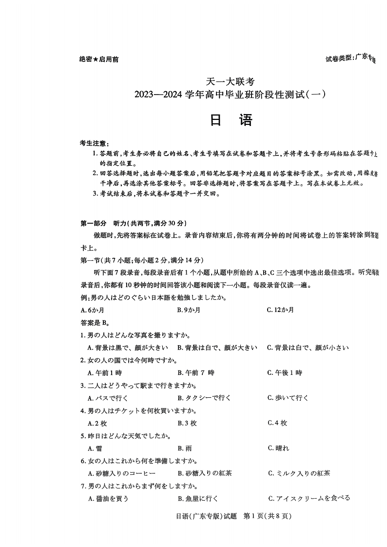 天一大联考2023-2024学年高中毕业班阶段性测试试题