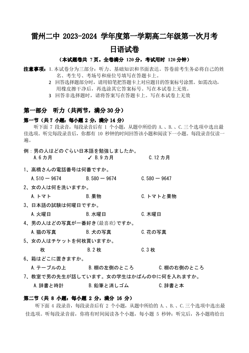 【试题】广东省湛江市雷州市第二中学2023-2024学年高二上学期10月月考日语