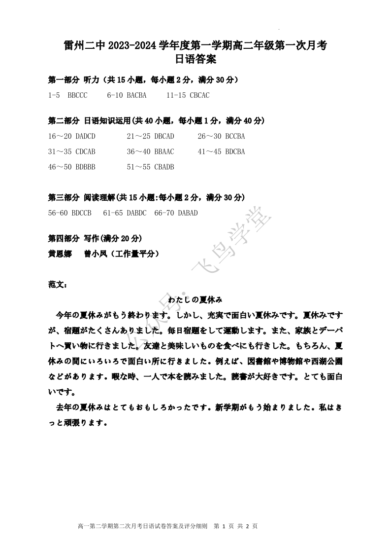 【答案】广东省湛江市雷州市第二中学2023-2024学年高二上学期10月月考日语