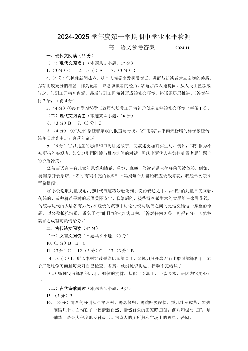 山东省青岛市区域2024.11高一年级期中检测语文答案