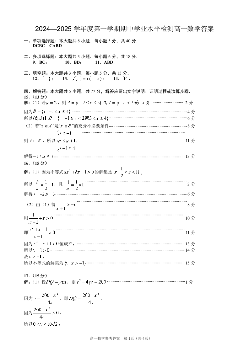 山东省青岛市区域2024.11高一年级期中检测数学答案