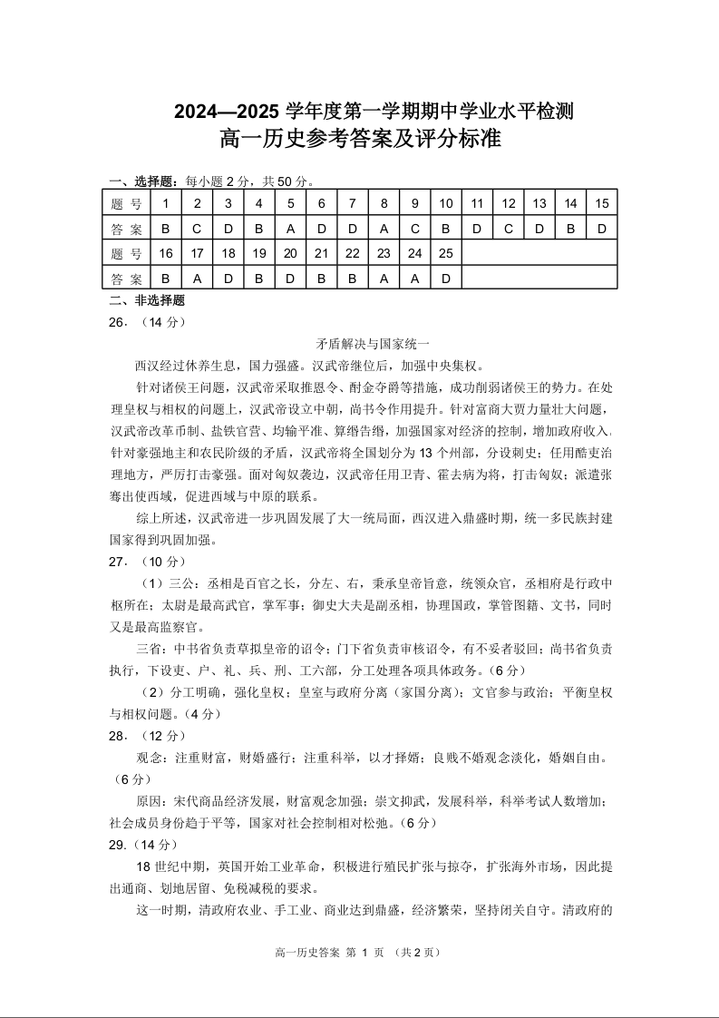 山东省青岛市区域2024.11高一年级期中检测历史答案