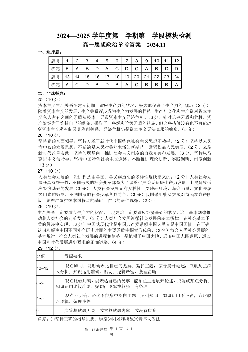 山东省青岛市区域2024.11高一年级期中检测政治答案