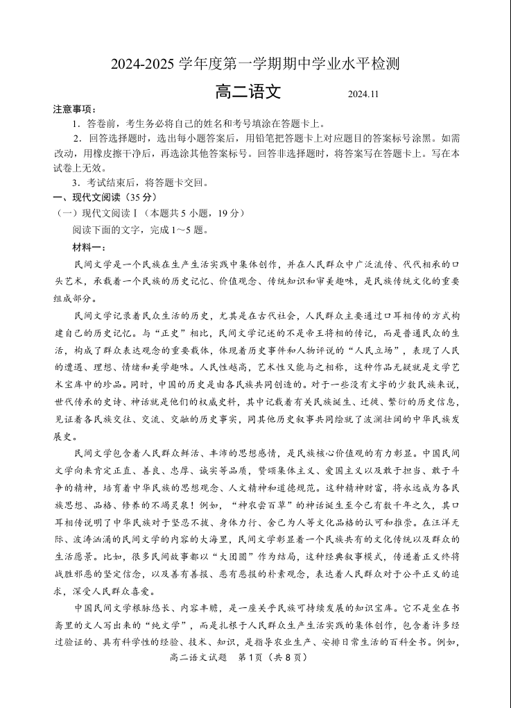 山东省青岛市区域2024.11高二年级期中检测试题语文