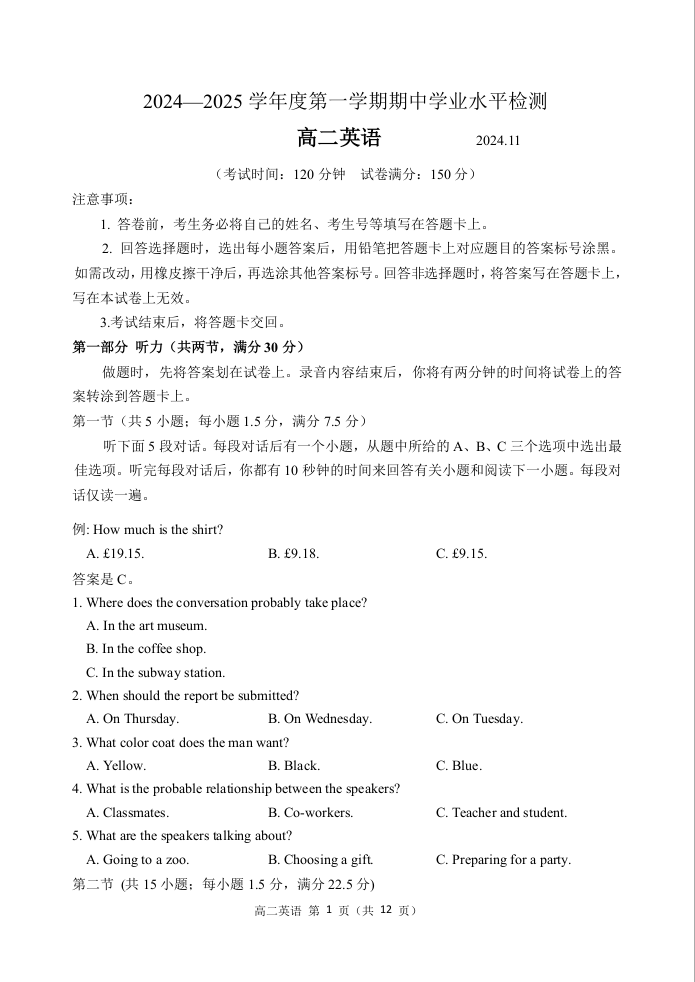 山东省青岛市区域2024.11高二年级期中检测试题英语