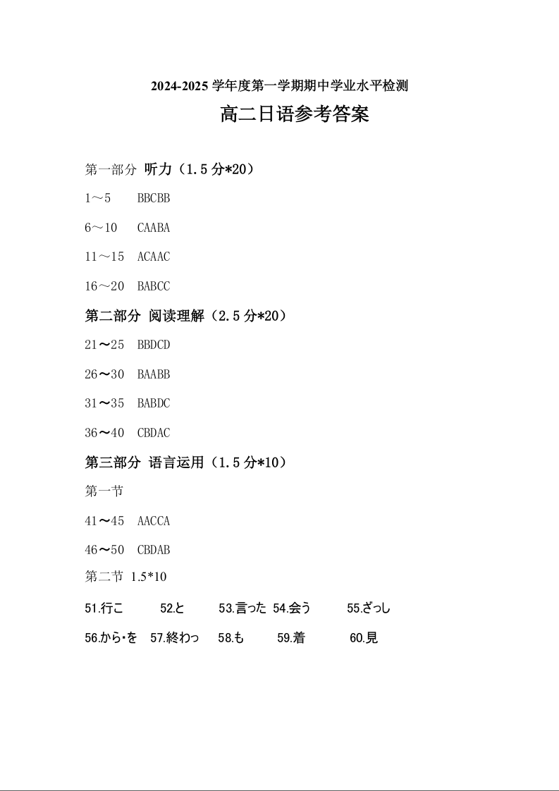 山东省青岛市区域2024.11高二年级期中检测试题日语答案
