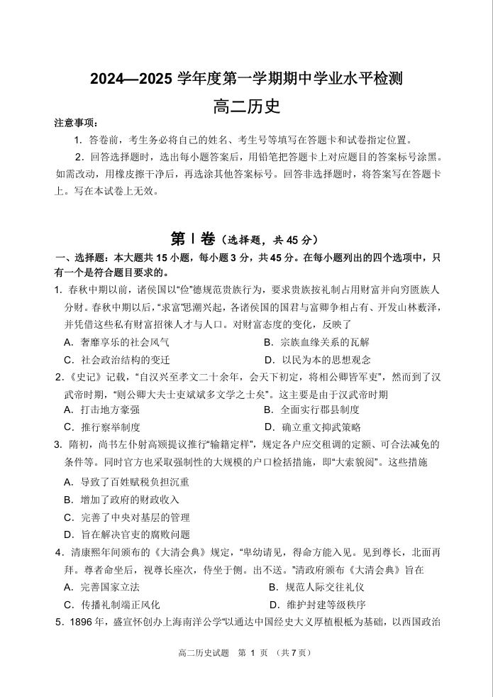 山东省青岛市区域2024.11高二年级期中检测试题历史